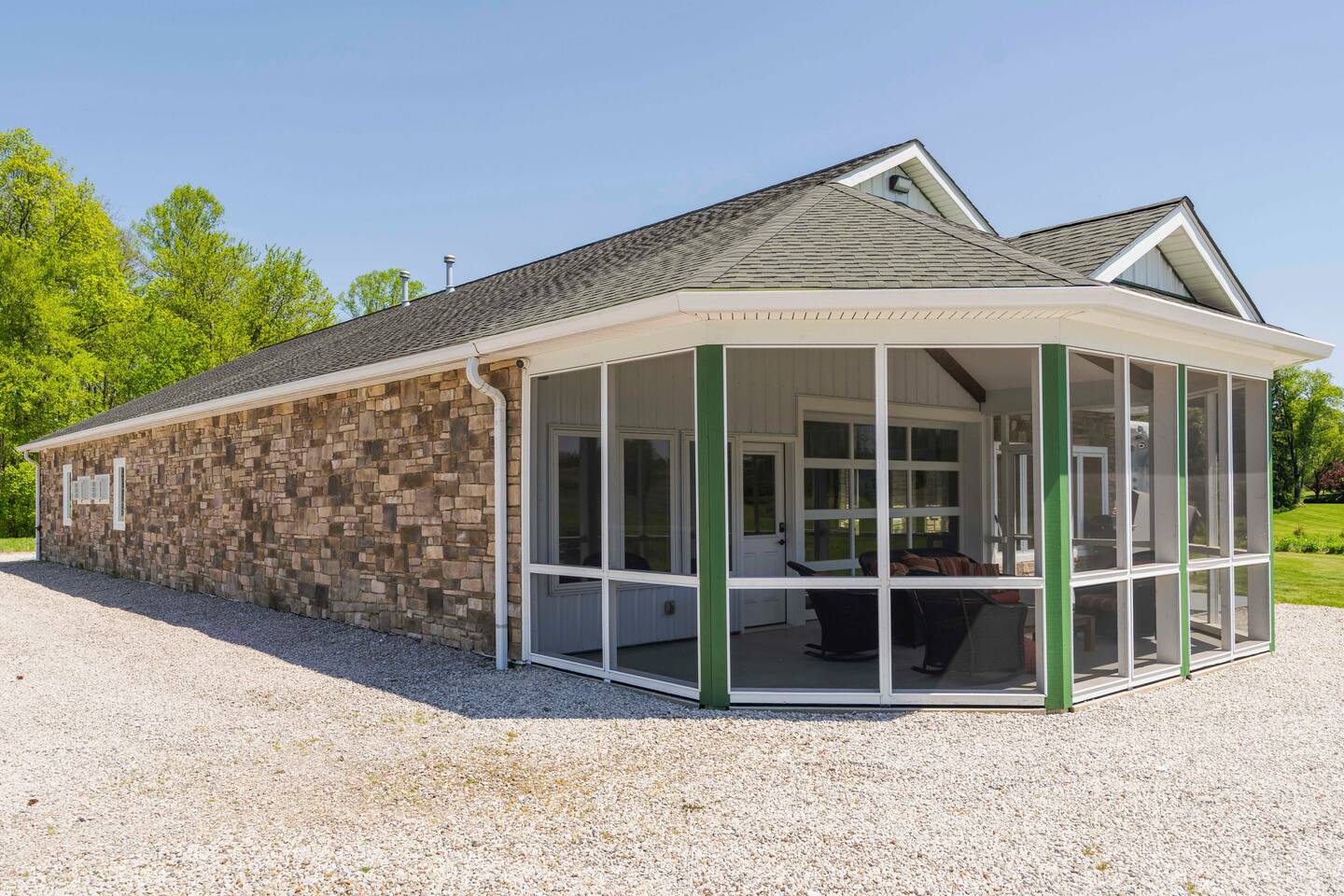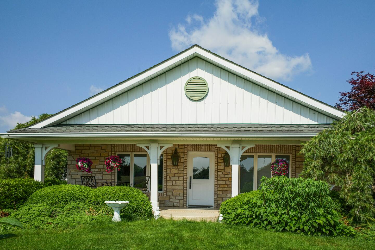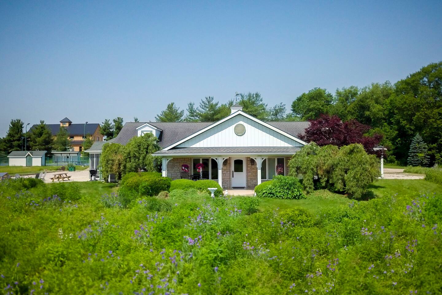 Once the beloved country cottage of the Smucker family (yes, the jelly makers!), this charming 4-bedroom, 1.5-bathroom home is set on 50 acres of stunning Ohio farmland. The property offers a completely private and secluded retreat yet is just minutes away from local amenities. Enjoy a top-notch tennis and pickleball court with lights for evening play, a bocce court, or indulge in the 40'x30' recreational room. This entertainment haven includes a big-screen TV, a stage for a band or DJ, space for a dance floor or cocktail tables, numerous pinball games, skee ball, a pool table, air hockey, and an attached screened-in porch. The home comfortably sleeps 10 guests, with accommodations including a king-size bed, two queen beds, a bunk bed, and a pull-out couch in the living room. Each bedroom has individual climate control, and the primary bedroom boasts an attached bathroom. The house features 1.5 bathrooms, with the full bathroom including a bathtub. Guests can make use of the washer and dryer, and there is ample free parking available on the gravel driveway. The full-size kitchen is fully equipped with all the essentials, including pots, pans, a baking sheet, and utensils. Modern appliances include a traditional coffee maker, gas stove, refrigerator, freezer, microwave, dishwasher, and toaster. For outdoor cooking, there's a gas grill ready for a BBQ. Outside, enjoy the property's bikes, fire pit, and outdoor dining area. Relax in the 6-person hot tub in the evenings. Surrounded by wildflowers that bloom from spring to fall and featuring a front porch swing overlooking a serene 3-acre lake, this property is a truly unforgettable retreat. Pets are welcome, with a limit of three. Our property has high speed internet wi-fi, Cable TV and good cell service. Once you research the area, you will see all the outdoor activities available within minutes from your doorstep. Canoeing, kayaking, trails, bird watching, Clays Water park, world class target ranges, and Amish country is just 20 minutes South. (Please drive safely due to Amish buggies). Sports Fans of all ages will enjoy Sluggers & Putters, which is also just minutes away in the Quaint town of Canal Fulton. The Canal Fulton Canoe Livery has canoes and kayaks available for rent and will pick you up later at multiple locations downstream. Stop at Clay's Park (Jellystone Water Park Resort), where you can find an Aqua Park that has water slides, swimming and splash grounds, gem mining and more. We have an ADT system set up with 4 exterior cameras that are on each corner of the home. They face the yard around the home and the driveway area. They can be covered per request. These devices are capable of recording.