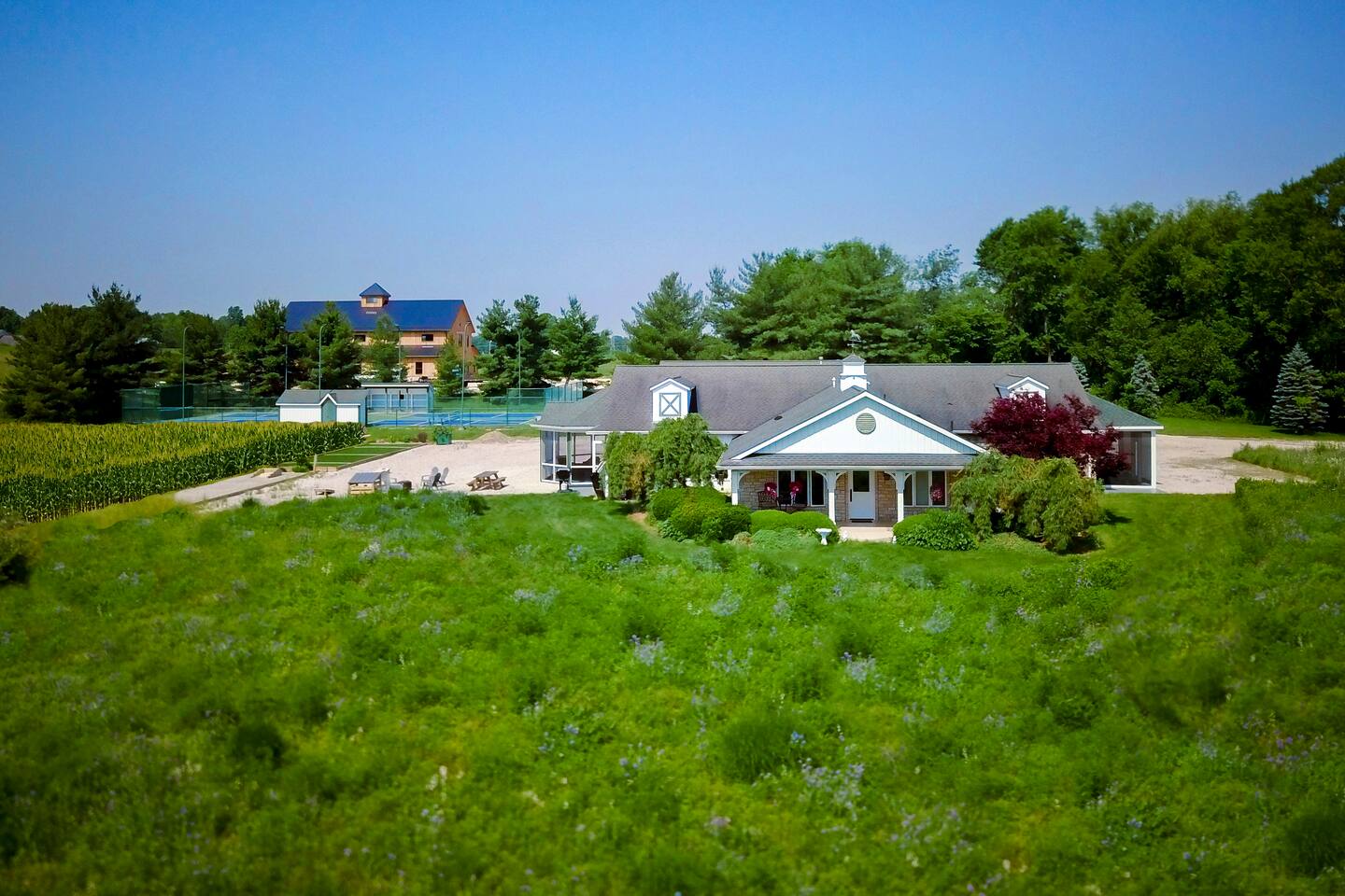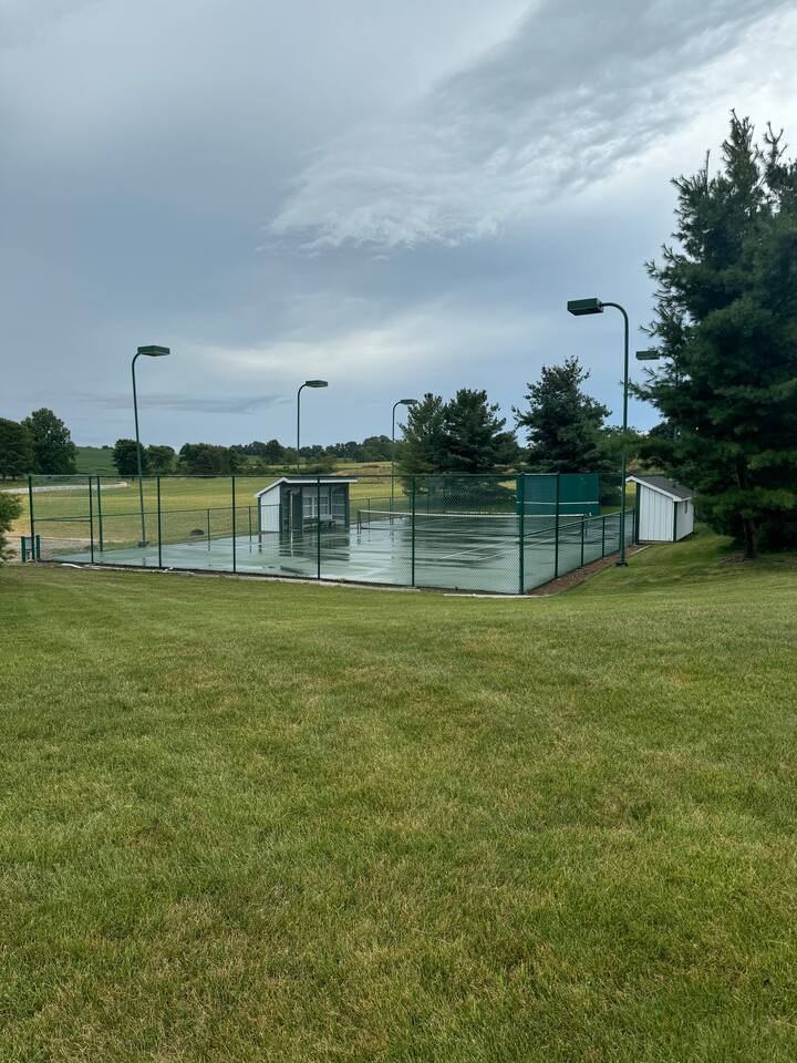 Formally owned by the Smucker Family (love their jelly's) and is a unique property that is perfect for a get away with tennis and pickleball court, regulation bocce ball court and horseshoe pit. Inside for rain days we offer air hockey games, pinball machines, ski-ball and a stage set up with state-of-the-art sound system and large hi def big screen TV for game day! Relax in the Ohio countryside in our six-person new hot tub while enjoying the privacy of hundreds of acres of farmland.